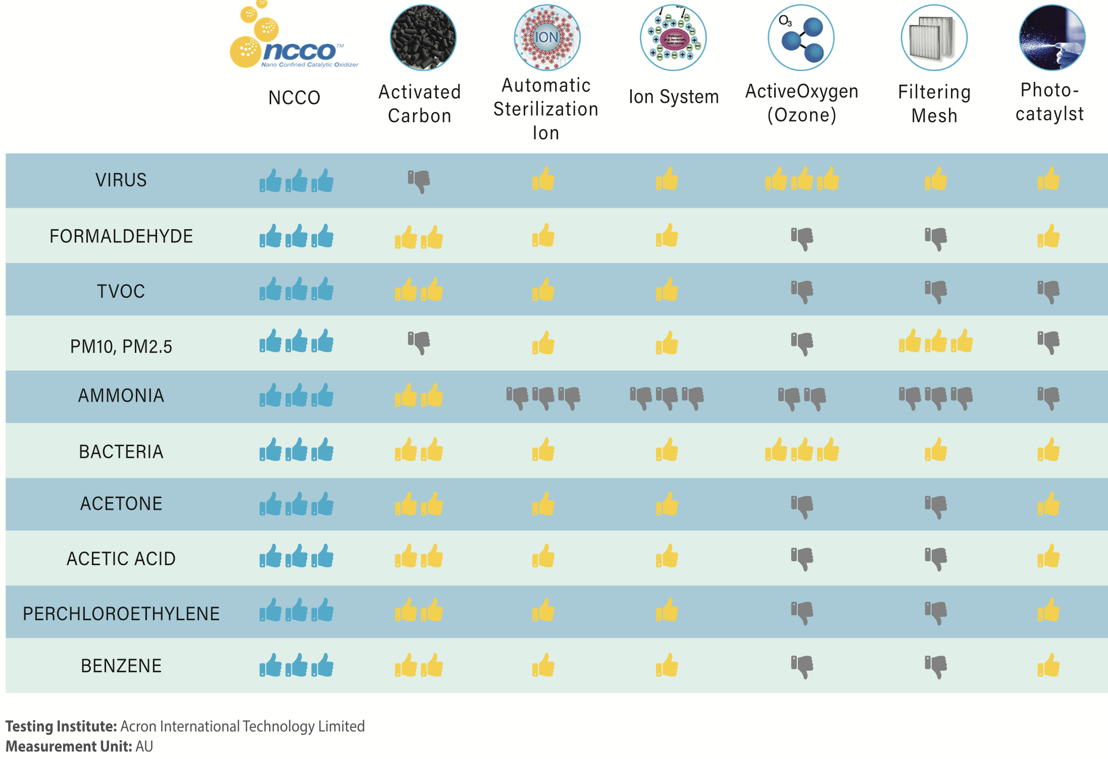 1) NCCO air purification technology can decompose pollutants into harmless water and carbon dioxide. It is not pure filtering and no saturation problems. It can kill bacteria and viruses and decompose harmful substances such as formaldehyde and no secondary pollution problems.